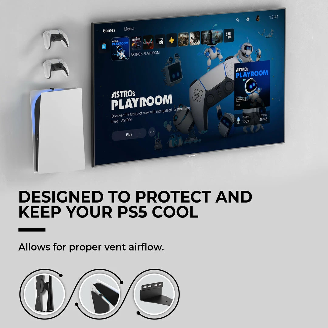 - Designed to protect and cool your PS5: The minimalist design of the mount allows for proper airflow with vent openings, and the mount is made of sturdy steel with a powder-coat finish to ensure the mount never rusts or chips.