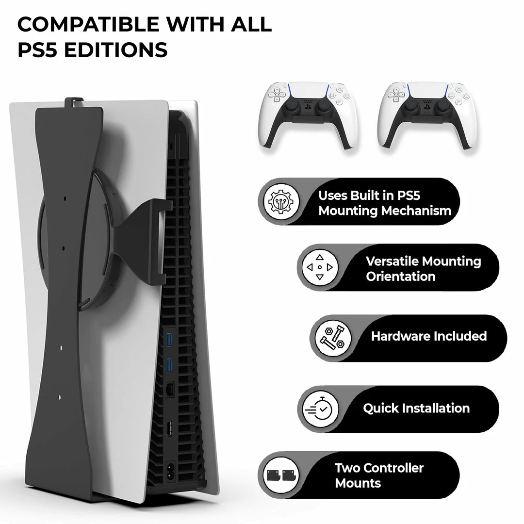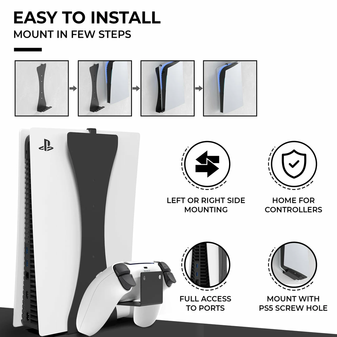 - HumanCentric Wall Mount for PS5 with Controller Mounts: Compatible with disc and digital versions of the Playstation 5. Includes two PS5 controller mounts. Avoid accidents and make the most of your space.